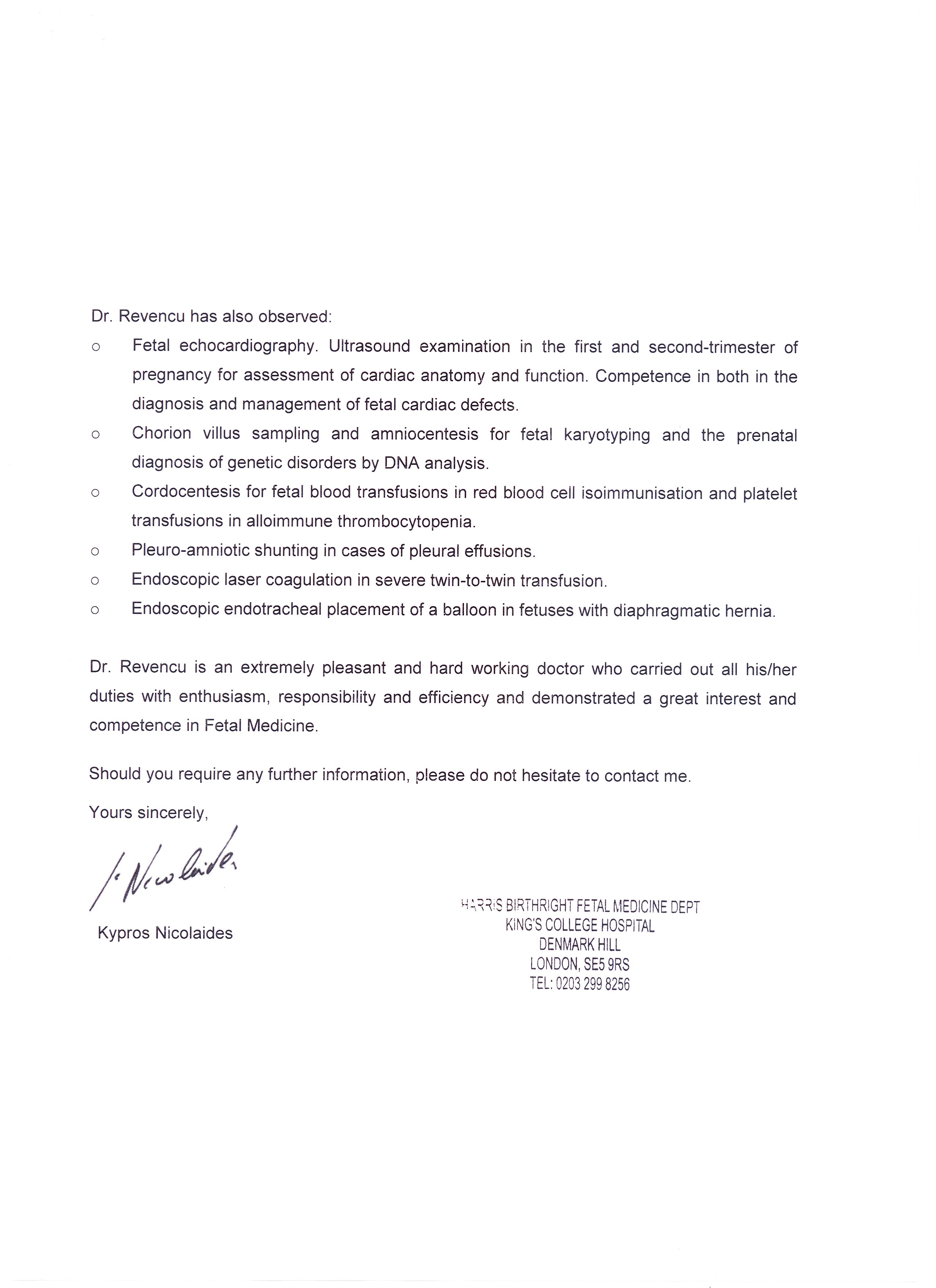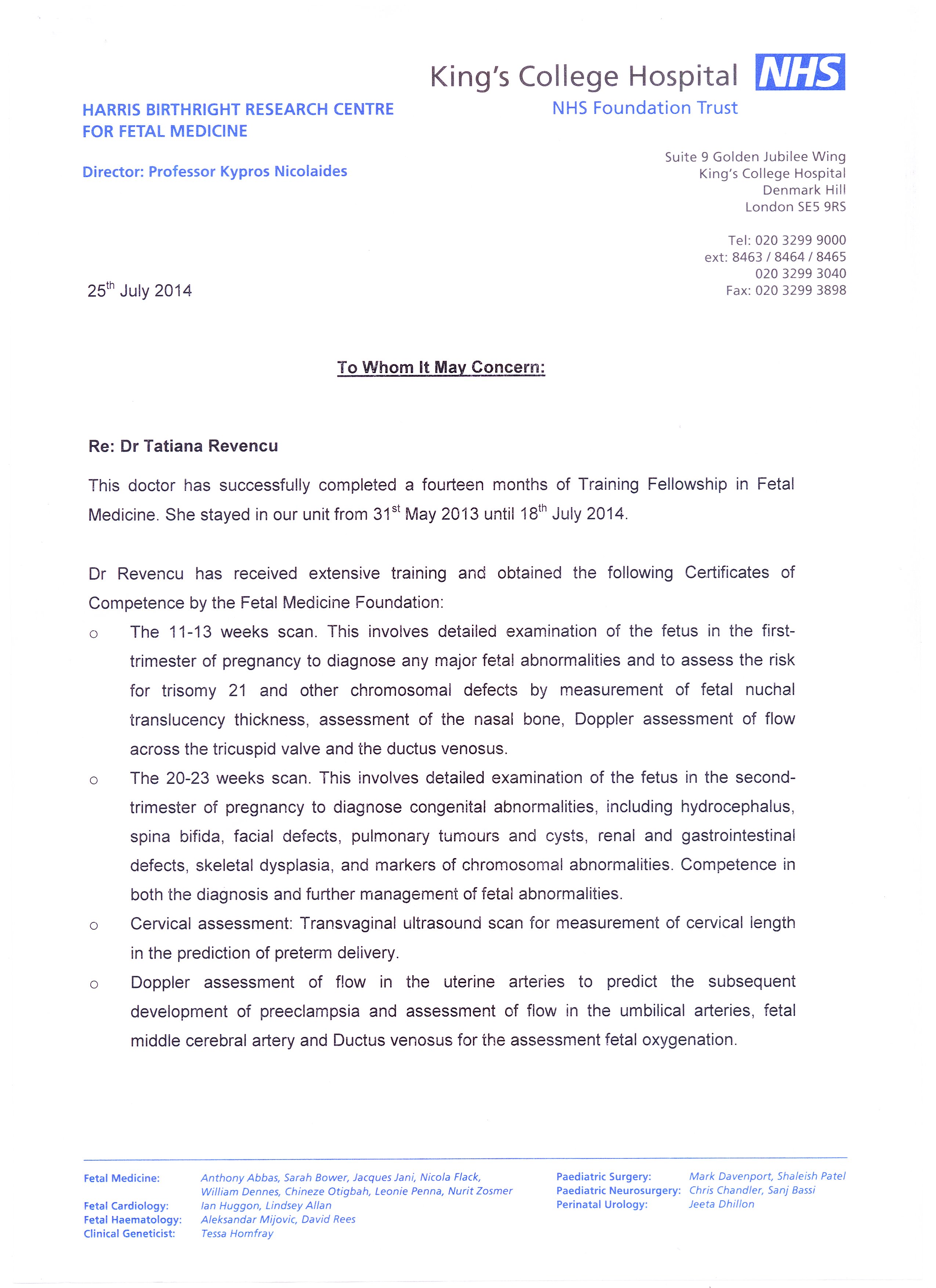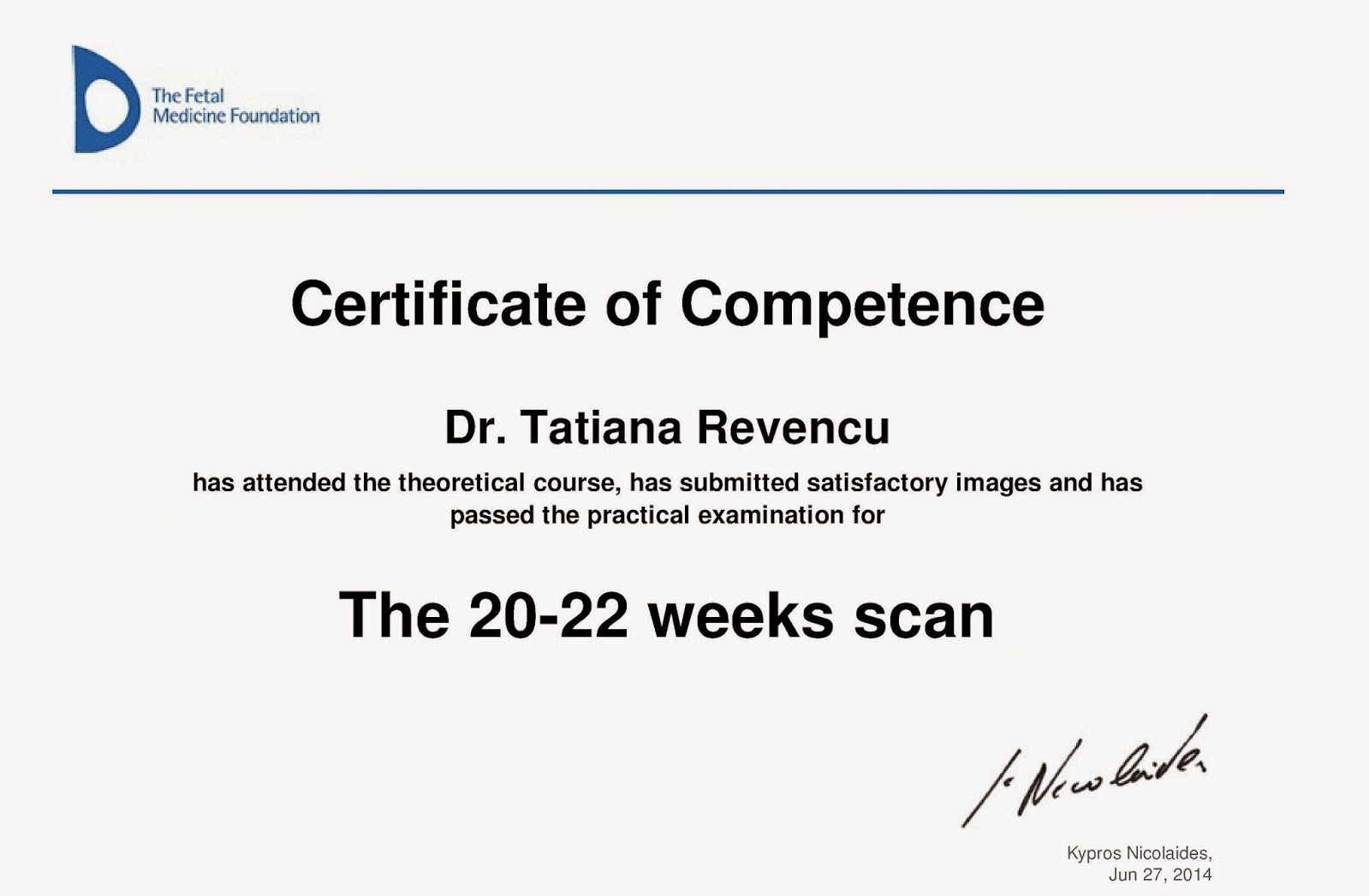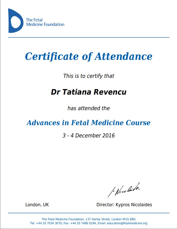 Доктор Татьяна Ревенку — врач акушер-гинеколог с компетенциями в области гинекологической и фетальной ультразвуковой диагностики. Ранее работала ассистентом кафедры акушерства и гинекологии в Государственном университете медицины и фармации имени Николая Тестемицану. Прошла надспециализацию по медицине матери и плода, а также по оценке врожденных пороков развития плода в рамках программы Fellowship в King’s College University Hospital в Лондоне в период с 2013 по 2014 год. Имеет сертификат FMF, подтверждающий квалификацию в диагностике аномалий развития плода, допплеровском исследовании и оценке шейки матки.